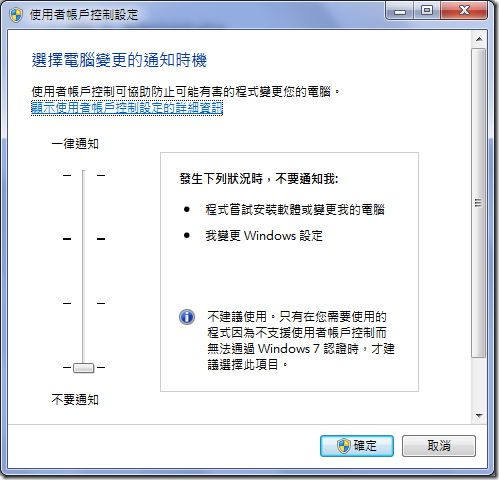 1. 先設定使用者帳戶控制設定(UAC)為最低。(由[控制台/使用者帳/變更使用者帳戶控制設定]進入設定)