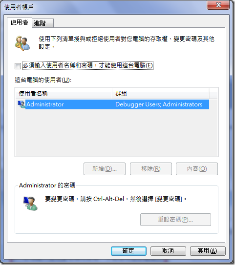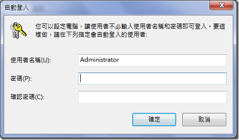 5. 輸入你想要自動登入的使用者名稱(administrator或其他自訂的user),再輸入二次該使用者的密碼。