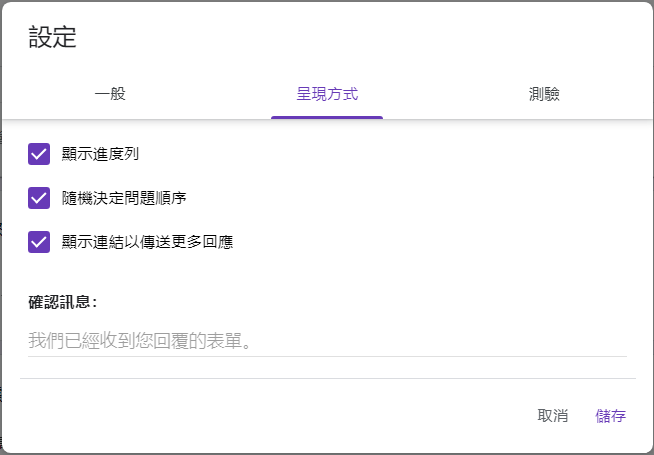 谷歌表單設定:呈現方式部分,